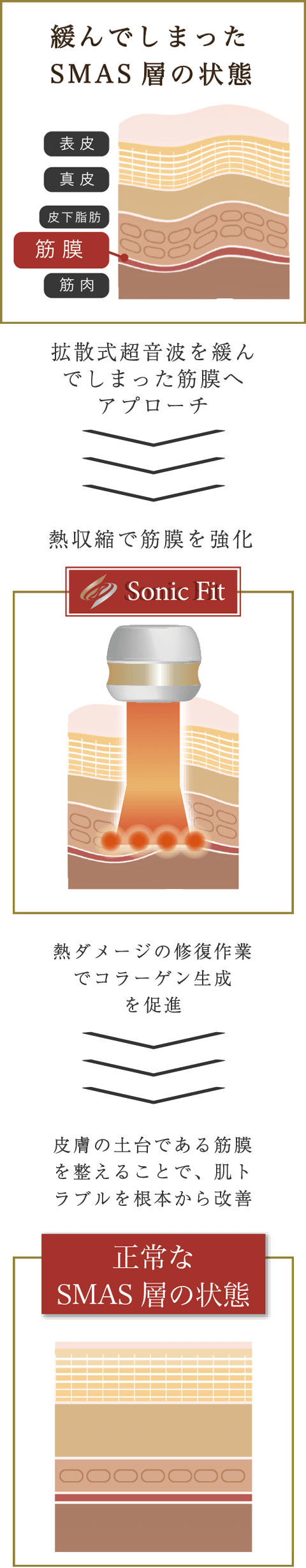皮膚の土台となる筋膜(SMAS層)にアプローチし、お肌の内部から